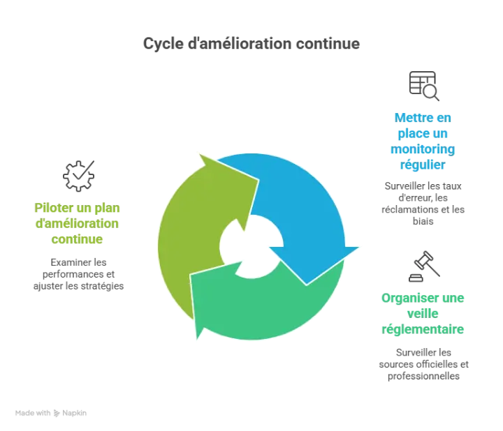 - Taux d’erreur, réclamations, biais, documentation à jour