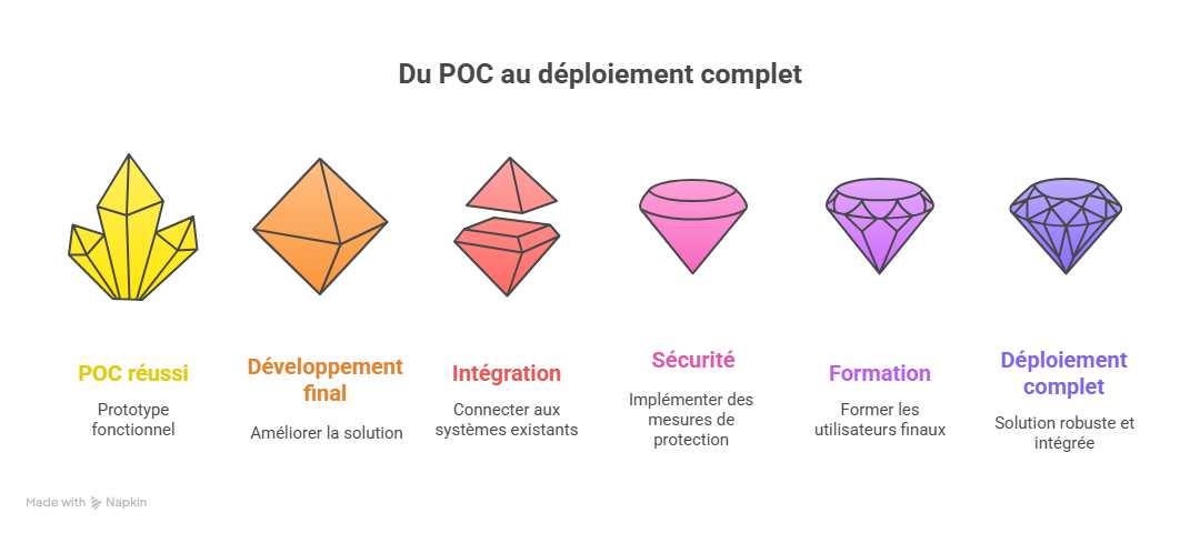 Votre POC est un succès ? Bravo. Maintenant, le vrai travail commence. Il faut transformer ce prototype en une solution robuste, intégrée aux vrais processus de l'entreprise. Cela implique le développement final, l'intégration avec vos autres logiciels, la mise en place de la sécurité, et surtout, la formation et l'accompagnement des utilisateurs finaux.