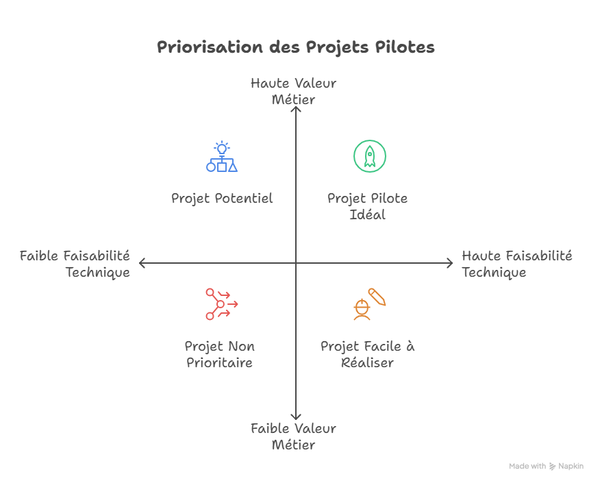 Le projet idéal est celui qui se situe dans le "carré magique" : forte valeur et haute faisabilité. C'est votre projet pilote.