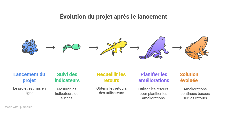 Le projet n'est pas terminé une fois qu'il est "live". Il commence à peine sa vie. Suivez en continu les indicateurs de succès que vous aviez définis à l'étape 3. La solution tient-elle ses promesses ? Recueillez systématiquement les retours des utilisateurs. Ces informations sont de l'or : elles vous permettront de planifier les futures améliorations et de faire évoluer votre solution.